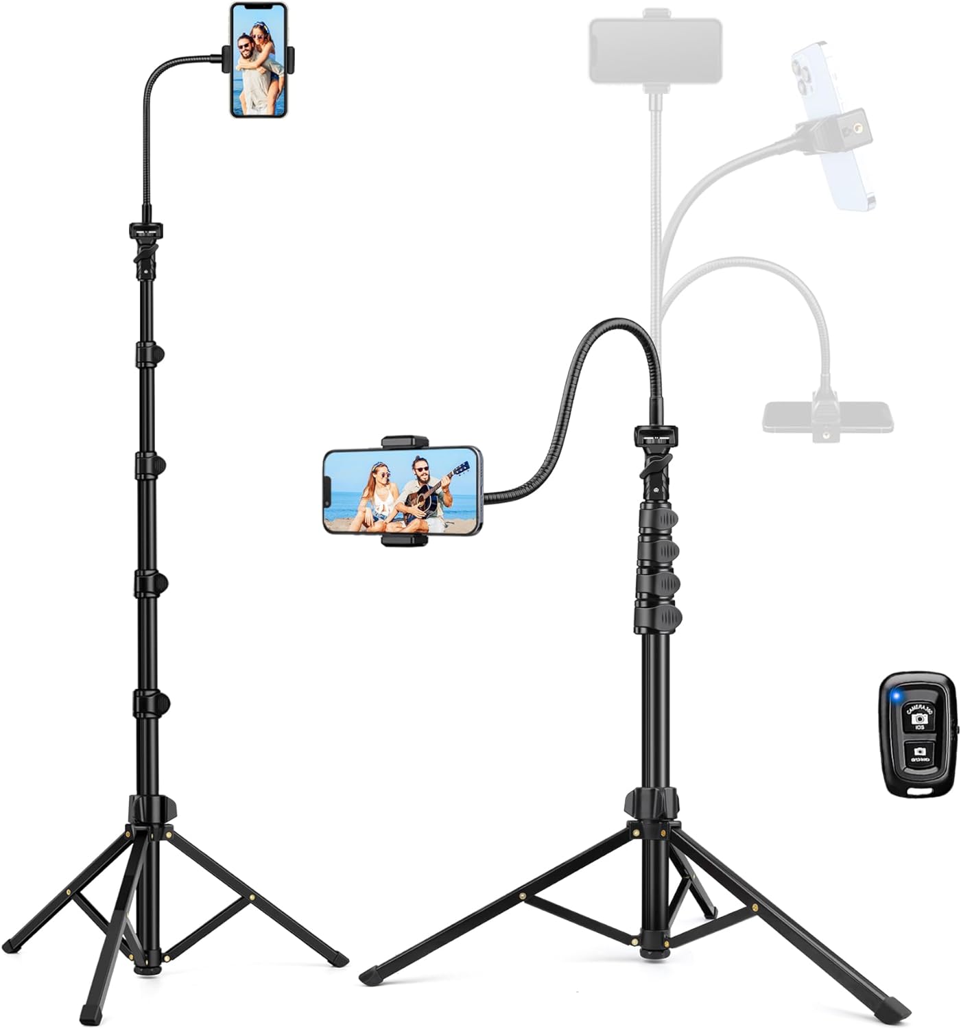 • 帶鵝頸的手機三腳架:有 4 段快速翻轉腿鎖,高大的手機三腳架可以從 21 到 85 英吋(約 215.9 公分)進行調整。 手機高三腳架配有 14 英吋(約 35 公分)彈性鵝頸,讓您從任何角度拍攝照片和影片,特別適用於長距離、低角度或高角度拍攝。 它旨在跟上您的時刻